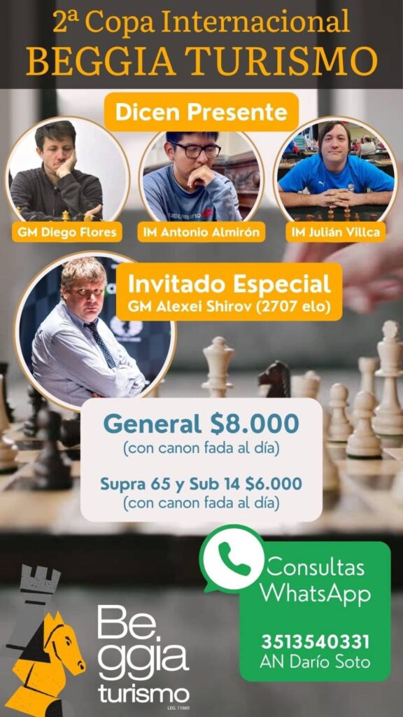 El certamen contará con la leyenda del ajedrez, Gran Maestro ALEXEI SHIROV. También participarán Diego Flores, Antonio Almirón y Julián Villca.