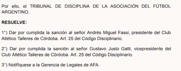 El Tribunal de Disciplina de la AFA resolvió dar por cumplida la sanción de 24 meses impuesta al presidente de Talleres por los incidentes con Andrés Merlos.