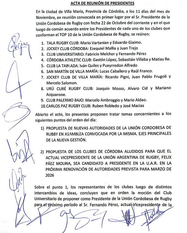 Los clubes de la Unión Cordobesa de Rugby acordaron por unanimidad impulsar la candidatura del actual vicepresidente de la UAR con una carta firmada en Villa María.
