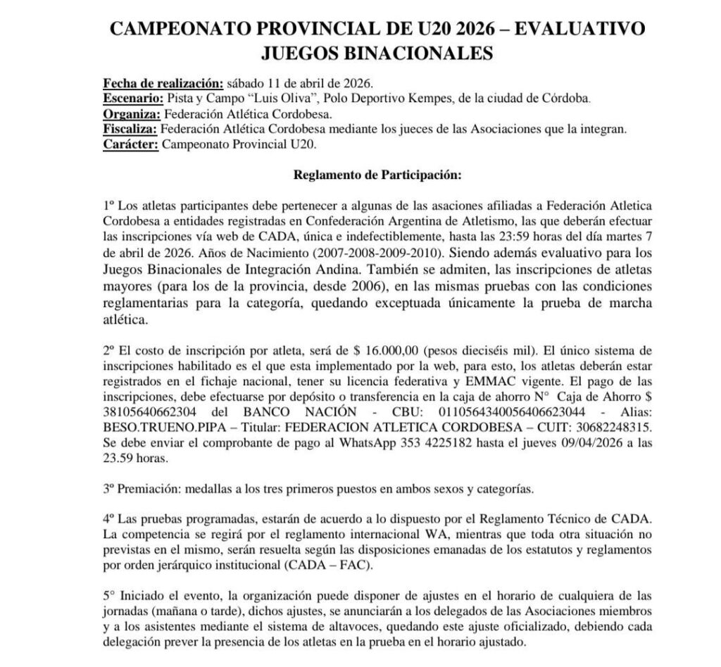La competencia será organizada por la Federación Atlética Cordobesa.