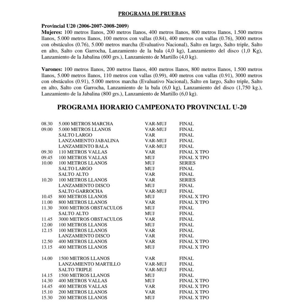 El Campeonato Provincial U-20 y Torneo de Mayores se desarrollará el venidero sábado 11 de abril desde las 8.30 en la pista «Luis Oliva» del Polo Deportivo Kempes.