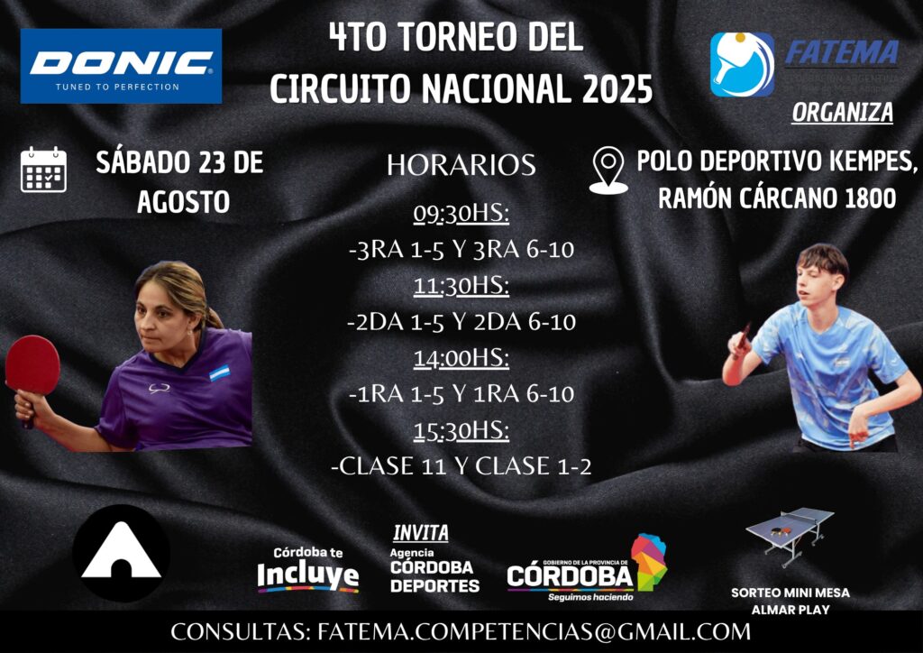 El próximo 23 de agosto, en el Polo Deportivo Kempes, Córdoba, se estará disputando el 4º Torneo del Circuito Nacional 2025 del TENIS DE MESA ADAPTADO.