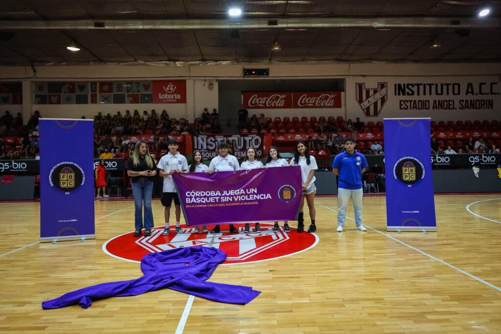La acción se llevó a cabo en el marco del Mes Contra la Violencia de Género, en el estadio Ángel Sandrín, antes del juego entre Instituto e Hindú, por la Liga Nacional Femenina.