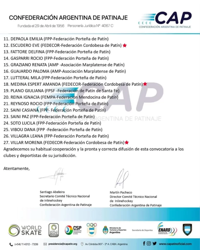 FEDECOR anunció con entusiasmo la convocatoria de sus deportistas Guadalupe Azelart, Rocío Azelart, Eve Escudero, Amanda Medina y Morena Villar a la concentración de la Selección Argentina Senior Femenina de Hockey en Línea.