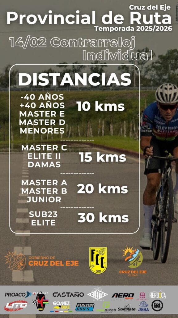 La doble competencia de Crono y Ruta convocará a ciclistas de toda la provincia en distintas categorías: -40 y +40 años, Máster A, B, C, D y E, Élite, Élite II, Sub 23, Juniors, Damas y Menores, con distancias que van de 10 a 80 kilómetros.