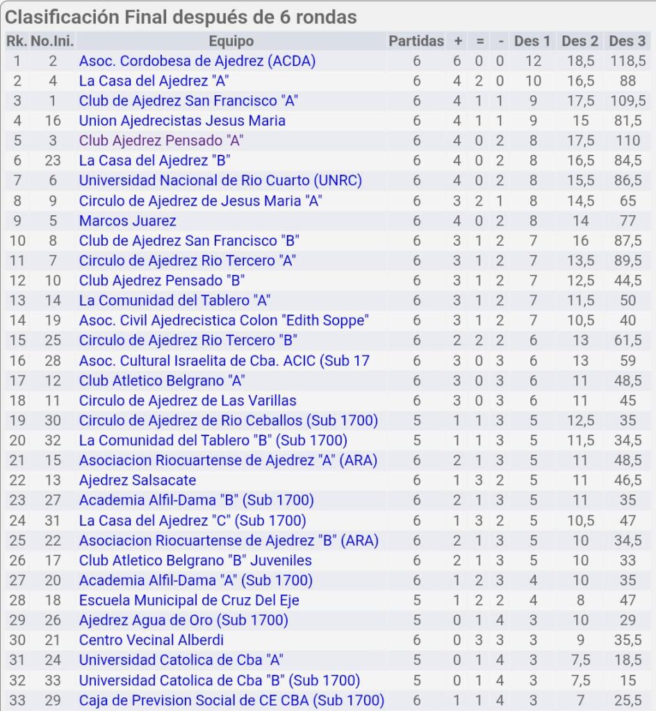 ACDA ganó el CAMPEONATO PROVINCIAL POR EQUIPOS UNIFICADO AAPC-FAPC 2025 «OSCAR PANNO», segundo fue LA CASA DE AJEDREZ «A», tercero el CLUB DE AJEDREZ SAN FRANCISCO «A», cuarto se ubicó