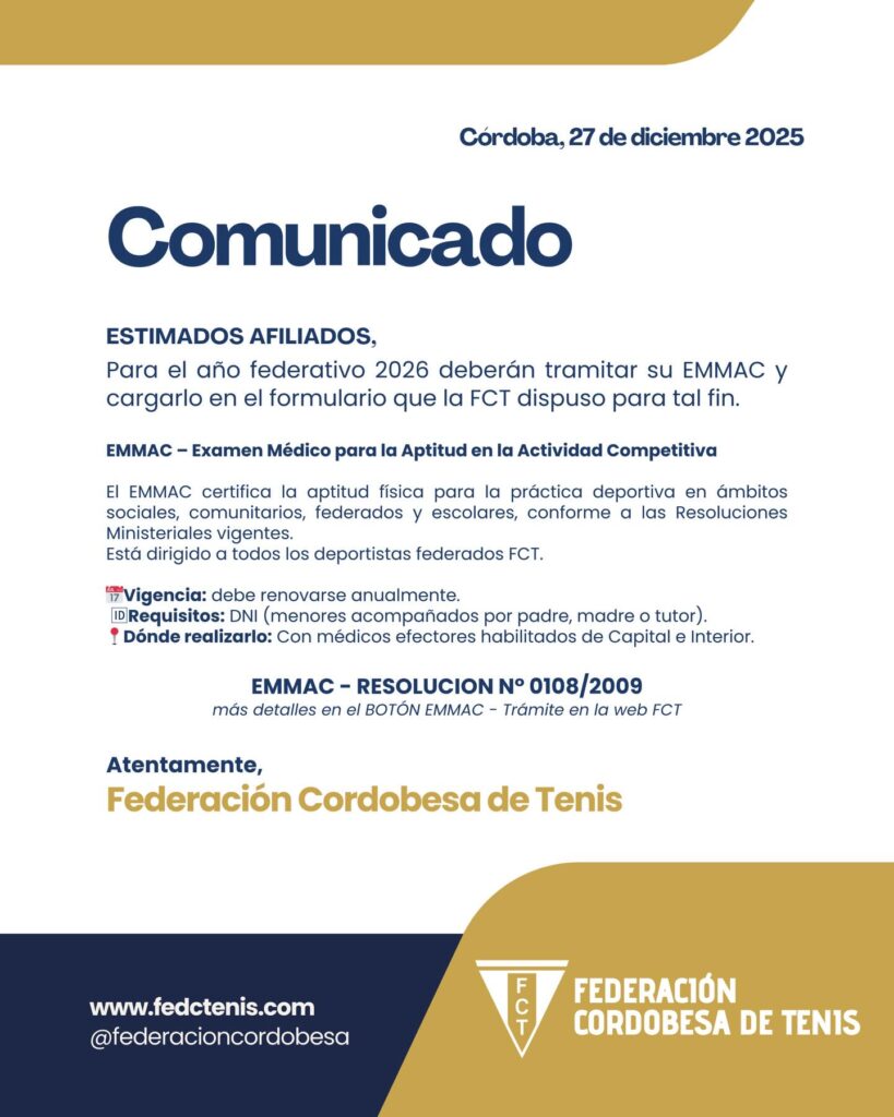 La Federación Cordobesa de Tenis informó que, para el año federativo 2026, todos los jugadores afiliados deberán realizar su EMMAC y tenerlo vigente para competir. Montos de afiliación disponibles para Temporada 2026.