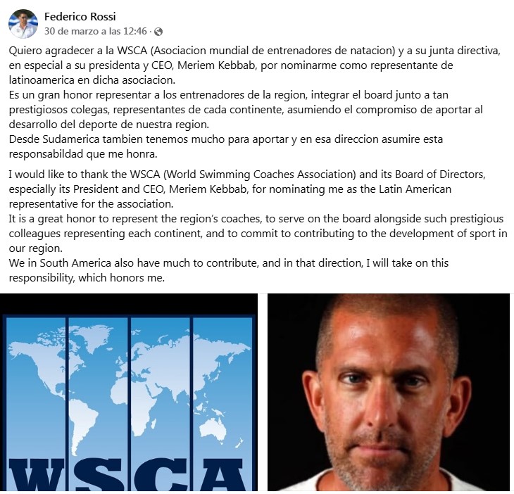 El entrenador de natación cordobés ha sido elegido como miembro del directorio y staff de formadores de la World Swimming Coaches Association (WSCA), la asociación mundial de entrenadores de natación más prestigiosa e importante del mundo.
