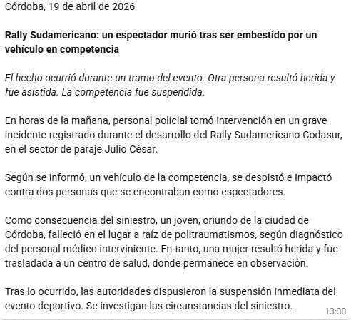 Un auto se despistó y se fue hacia una zona con público; falleció un cordobés de 25 años. Hay dos mujeres heridas, fuera de peligro. Se canceló la competencia del Rally Sudamericano.