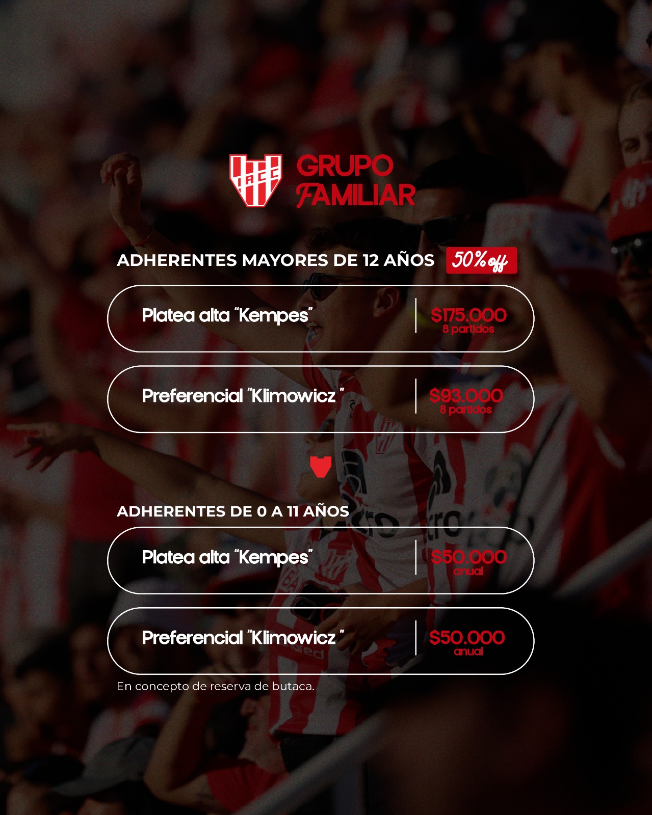 Grupo Familiar: adherentes mayores de 12 años acceden a 50% de descuento en Platea Alta Kempes y Platea Preferencial Diego Klimowicz por los 8 partidos. Adherentes hasta 11 años abonan un concepto anual por reserva de butaca.