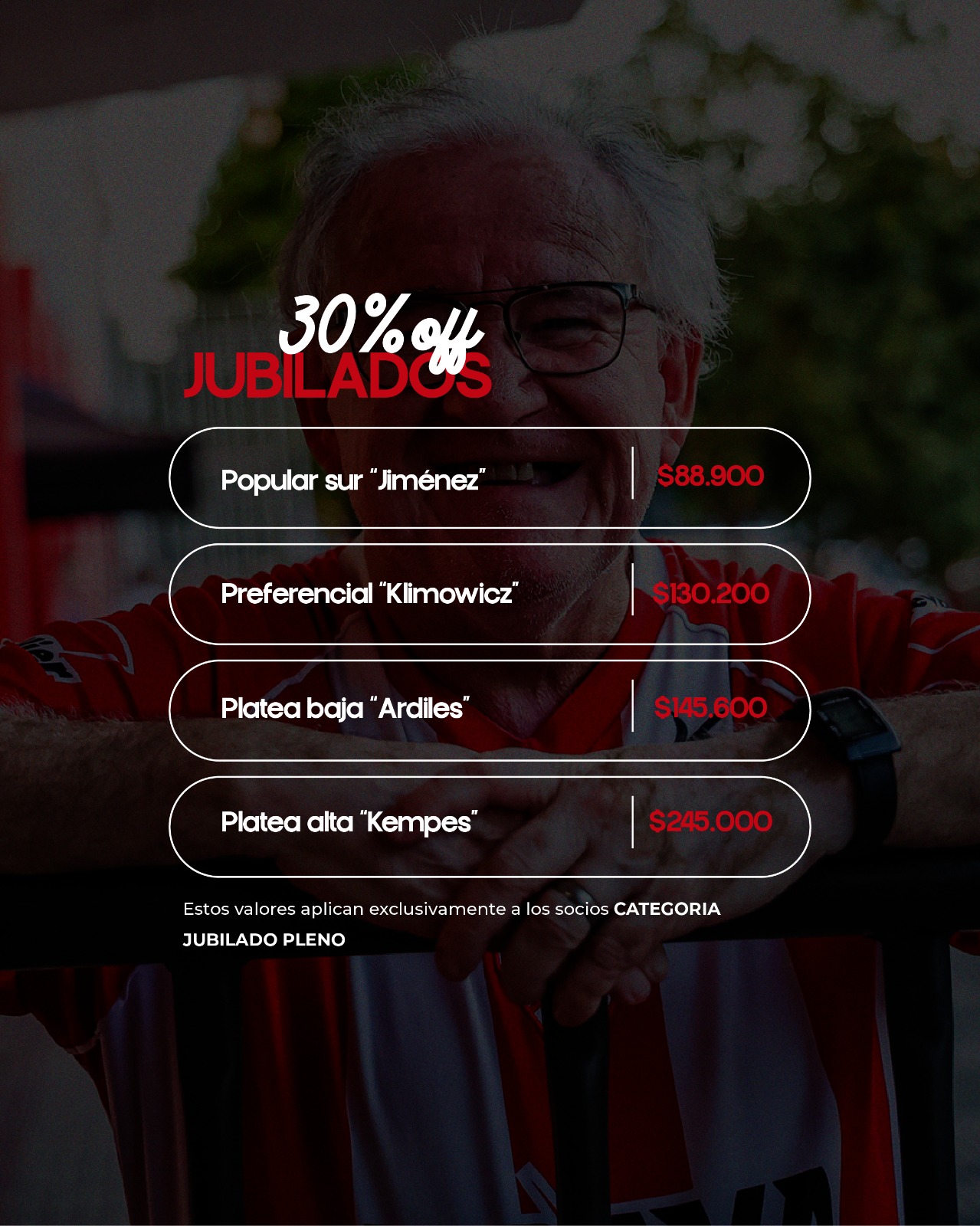 30% de descuento, los valores aplican exclusivamente a la categoría Jubilado Pleno.