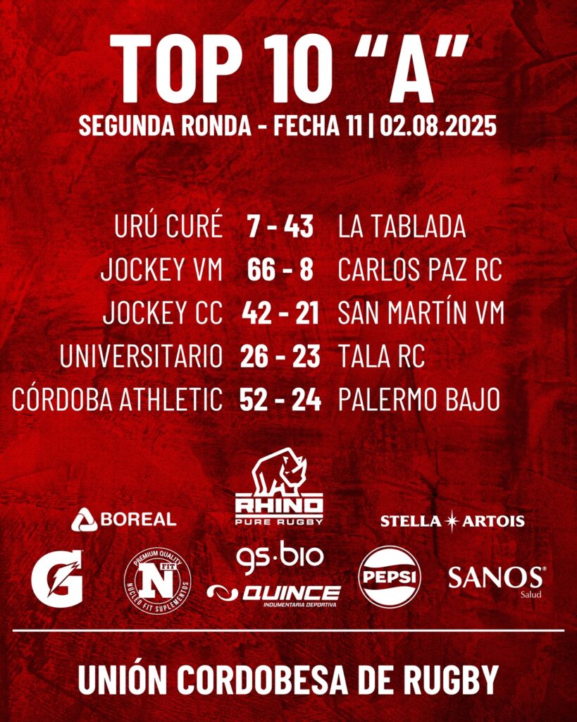 La 11ª fecha del Top 10 «A» entregó resultados claves para la parte alta de la tabla. Ganaron Jockey Club Córdoba, Universitario, Córdoba Athletic y La Tablada.
