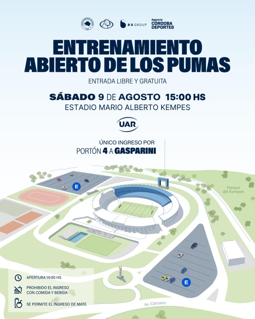 Este entrenamiento será el único abierto en la antesala de la fecha 1 de la 14ª edición del Rugby Championship, en la cual Los Pumas recibirán a los All Blacks el próximo sábado 16 de agosto a las 18.10 en el Estadio Mario Alberto Kempes.