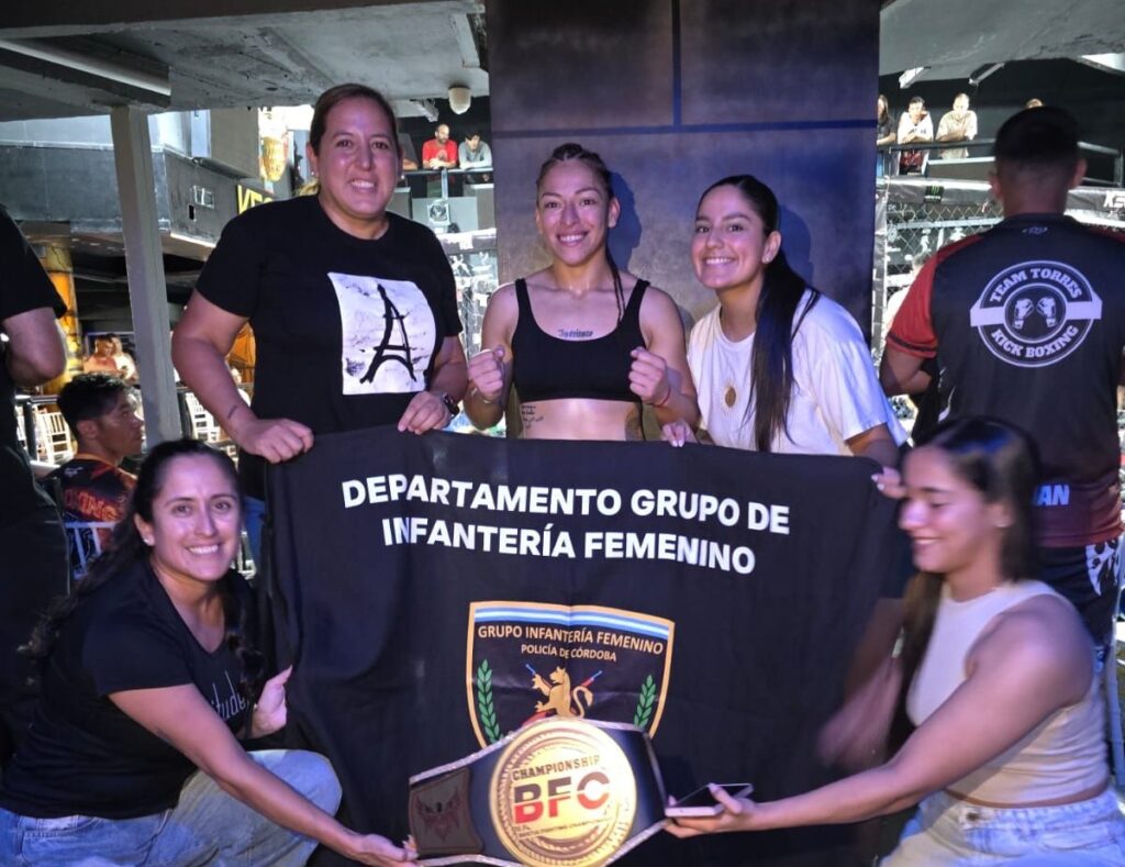La Policía de Córdoba celebra el logro de la oficial ayudante Milagros Moreno, quien se consagró campeona en el reconocido escenario de Keops Disco, en Villa Carlos Paz, obteniendo el cinturón del evento “Bestia Fighting Championship”.