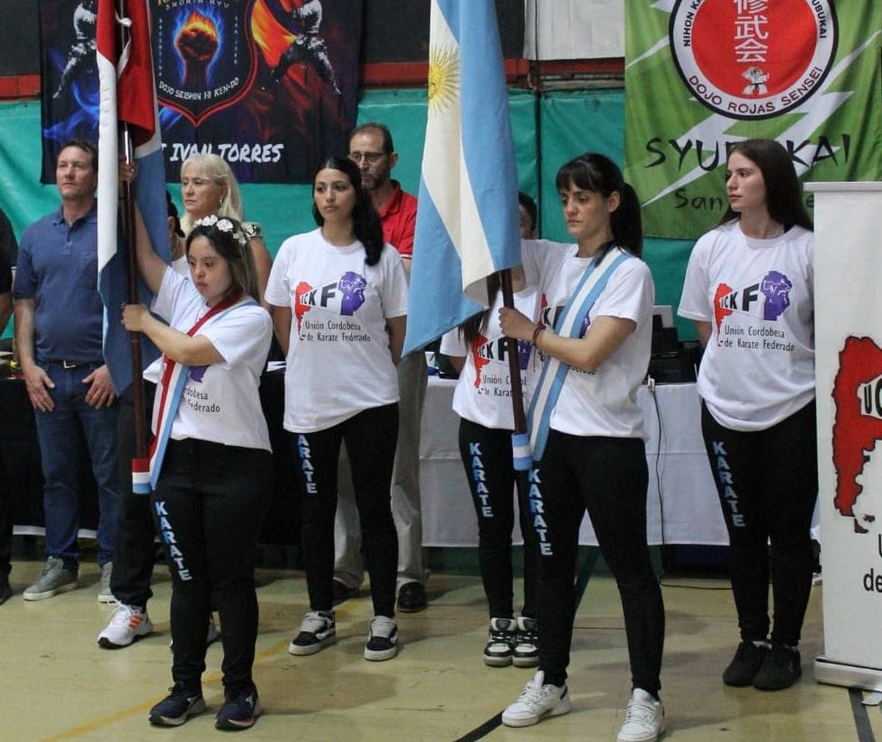 Bandera de Córdoba: Maitena Ardiles (Subcampeona Sudamericana en Para-Karate, 6 veces campeona nacional y primer Cóndor de la Gente de la ACD), escoltas: Julieta Mancilla y Morena Cáceres.