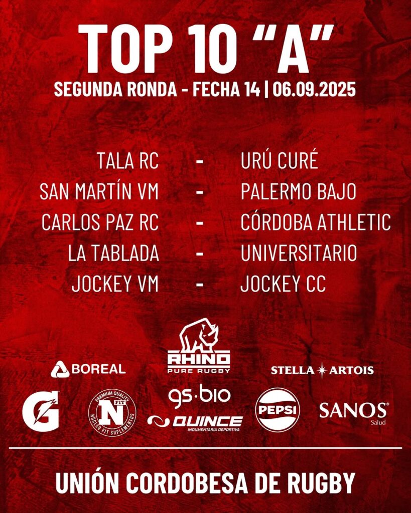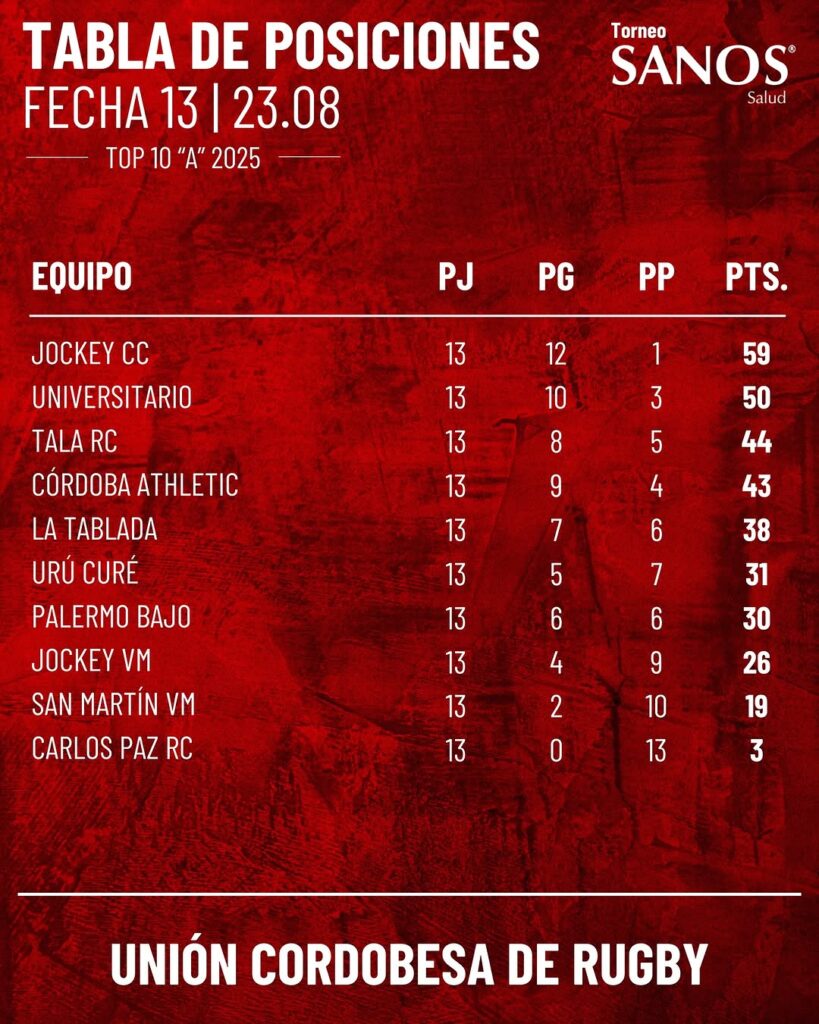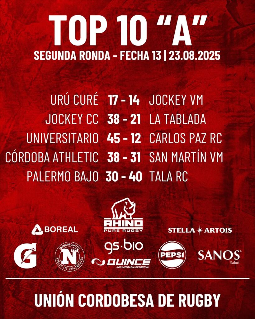 Palermo Bajo - Tala RC. Publicado enPolideportivo Rugby Se jugó la Fecha 13 del Torneo TOP 10 “A” de la Unión Cordobesa de Rugby 24/08/2025 Aquí los resultados de la 13ª fecha del Top 10, posiciones y próxima fecha. RESULTADOS: POSICIONES: PRÓXIMA FECHA: