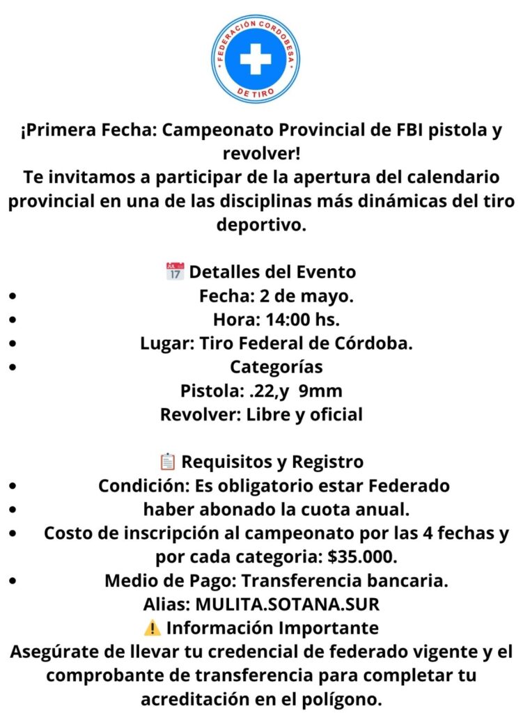 Se disputará el sábado 2 de mayo desde las 14.00 en el Tiro Federal Córdoba, en las categorías Pistola 22 y 9 mm.- Revolver Libre y Oficial.