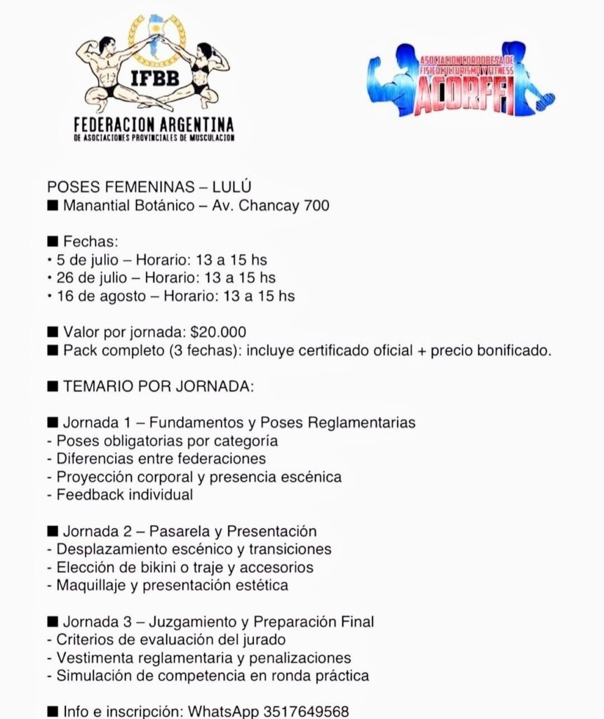 Para las categorías femeninas, la experta será Lulú, campeona sudamericana y una de las entrenadoras más respetadas en la disciplina. Su experiencia y conocimiento en las poses reglamentarias serán de gran valor para las atletas que buscan perfeccionar su presencia escénica.