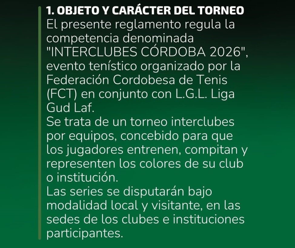 Torneo INTERCLUBES de la FEDERACIÓN CORDOBESA DE TENIS junto a LIGA GUD LAIF que comienza el 19 de abril. Aquí su Reglamento.