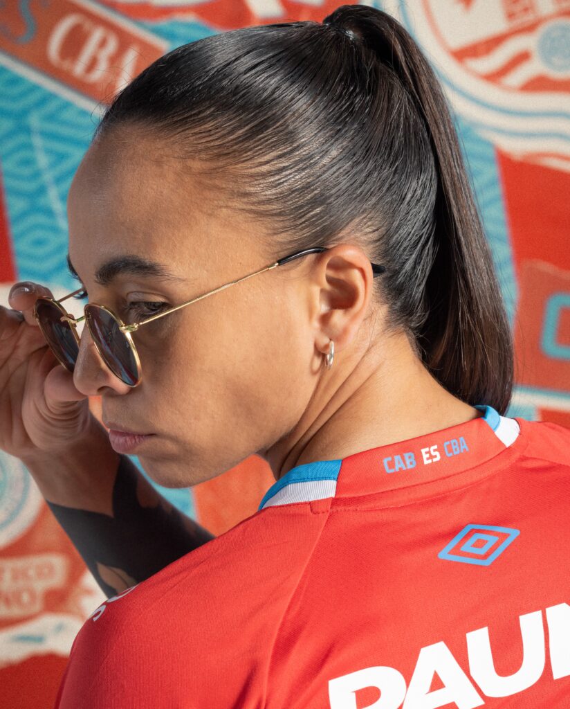 De base roja, presenta un grafismo sutil sublimado en el frente que evoca una bandera flameando símbolo de orgullo, lucha y pertenencia. El cuello tricolor con escote en «V» combina blanco, celeste y rojo, e incorpora un transfer bicolor con la inscripción «CAB ES CBA», expresión que sintetiza el vínculo entre el Club y su provincia.